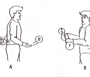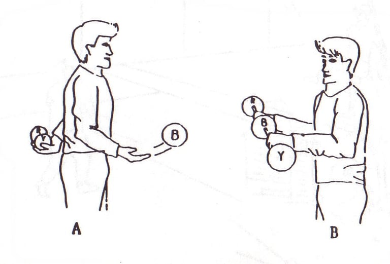 Full Turn: Ball A goes from starting baton, on full turn (circle), back to starting baton. Practice double, triple, or unlimited rotations and catches. Flip Jugglestick as high as you like. The higher, the better for depth perception.